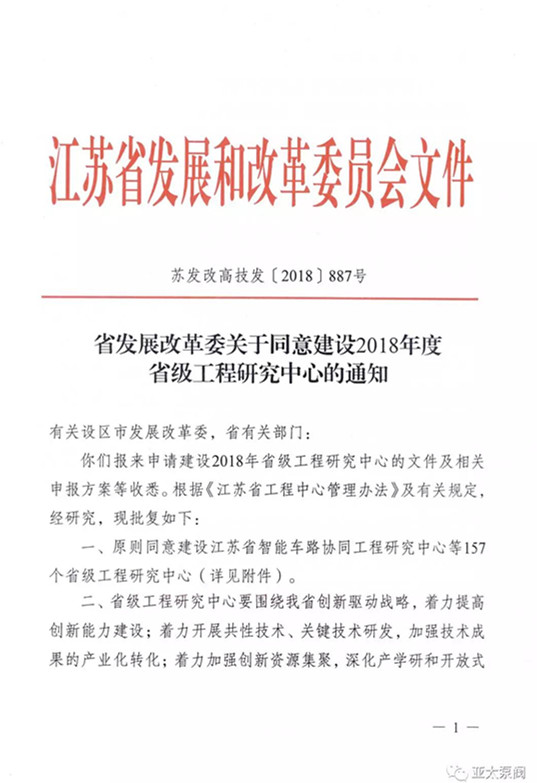 近日,省发改委正式发文,同意建设2018年度省级工程研究中心,旺财28泵阀有限公司申报的省级创新平台江苏省特大型潜水电泵及泵站系统工程研究中心成功获批,成为我省水泵行业唯 一入选企业。